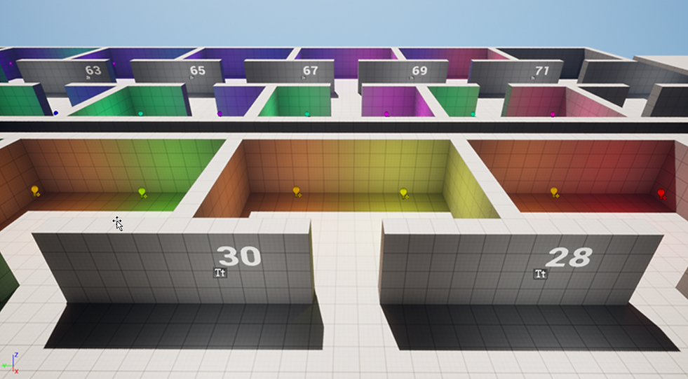 After conducting two colored lighting contrast tests, an additional experiment was designed to assess the impact of single-colored lighting with varying saturation levels. A long corridor was created, featuring single-colored lighting with intensities ranging from high to low. Based on the first experiment’s results, six representative colors were selected: Orange, Red, Dodger Blue, Green, Blue, and White. These colors covered various potential levels for creating tension. Testers moved slowly through the corridor, pausing for approximately 5 seconds at each numbered section, and recorded at which point they began to experience tension.